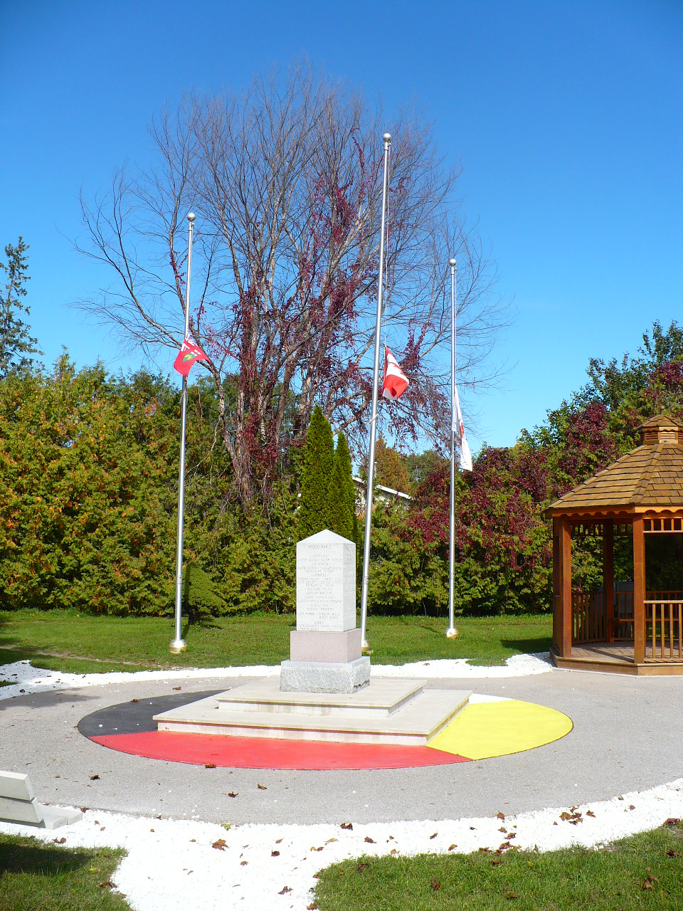 This cenotaph, a tribute to the members of the Curve Lake First Nation Band, who served in the major conflicts of the 1900's. It stands proudly in a small, well-kept park near the village centre. The ground surrounding the memorial is in the form of a medicine wheel, which gives great strength to the names engraved on this marker. Originally erected in 1987, it was updated and re-dedicated in 2011.