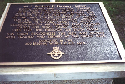 DURING WORLD WAR II AIRCREW TRAINING BASES WERE ESTABLISHED ACROSS CANADA. NO. 5 BOMBING AND GUNNERY SCHOOL WAS BASED ON THIS SITE NEAR DAFOE FROM 1941 TO 1945 AND TRAINED HUNDREDS OF AIRCREW FOR THE FIGHT AGAINST TYRANNY. AIRCREW TRAINED IN CANADA UNDER THE BRITISH COMMONWEALTH AIR TRAINING PLAN TOTALLED 131,553 AND SOME 40,000 GAVE THEIR LIVES FOR THE FREEDOM WE ENJOY TODAY.