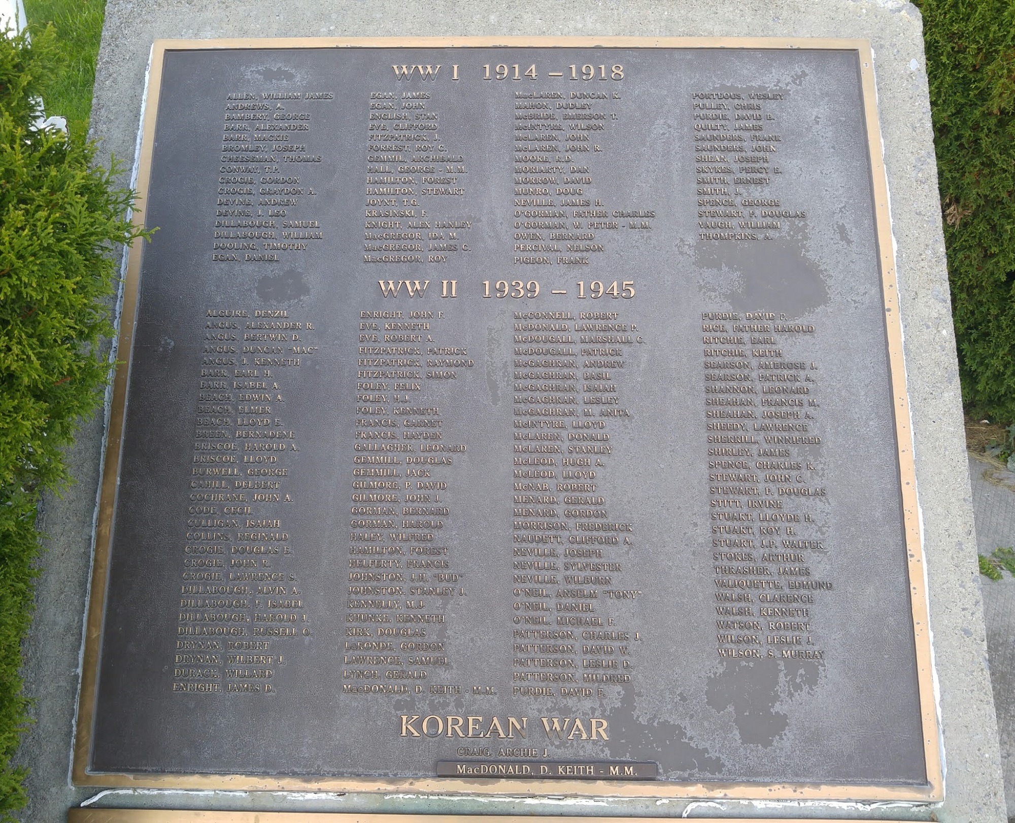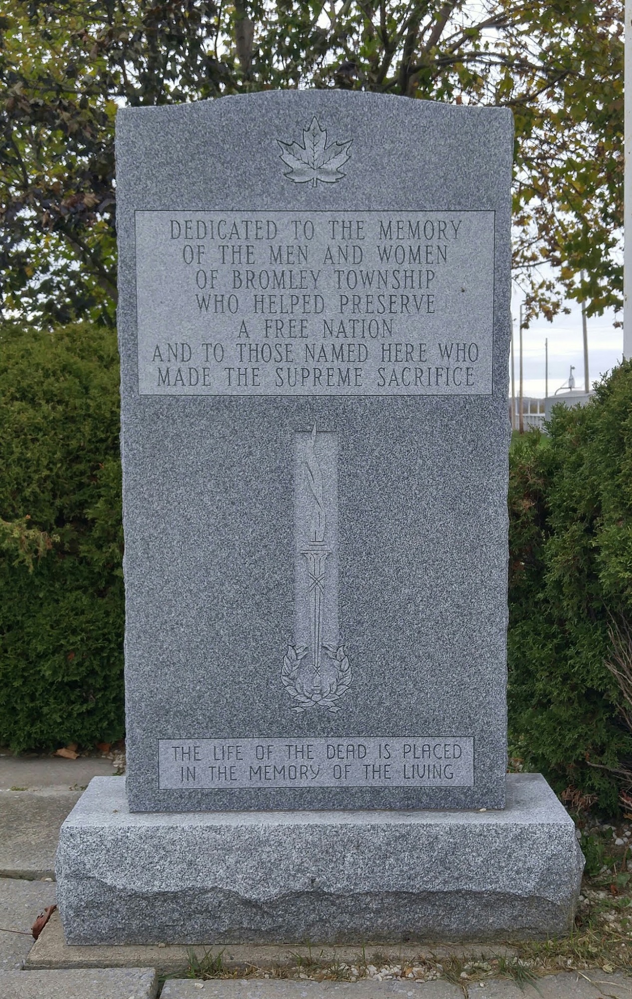 This memorial is dedicated to the men and women who served in the First World War, the Second World War and the Korean War. It was erected in 1998 by the Bromley Township Remembrance Committee.
