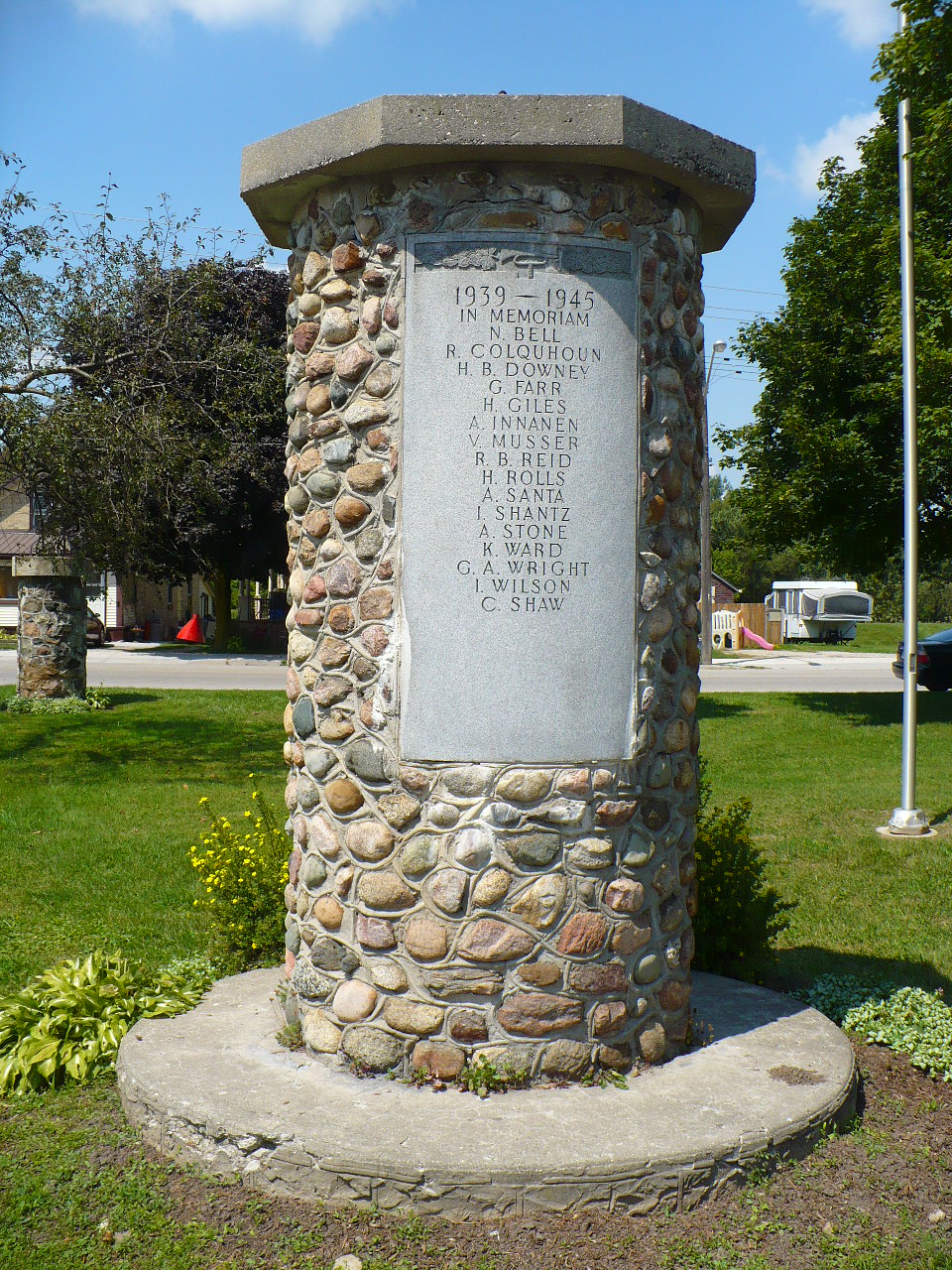 In 1927, the Drayton Women’s Institute, led by then-president Isabel (Peggy) Henderson, took matters into their own hands to construct a soldiers' memorial for the Townships of Maryborough and Peel. Lieutenant Governor of Ontario W.D. Ross unveiled the cenotaph on July 27, 1927. It consists of a stone pillar topped with a ring of electric lights and a tablet listing the names of the fallen soldiers of the First World War. At the ceremony, 14 children placed baskets filled with poppies at the foot of the monument, one for each of the fourteen names engraved on the tablet. Three names were added in later years. After the Second World War, names of the fallen soldiers from that war were added.