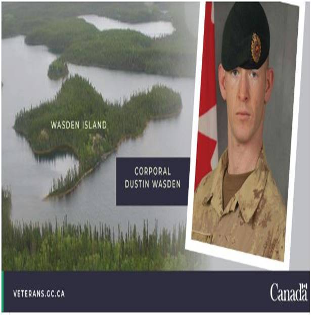 Dustin Wasden Island was dedicated in memory of Corporal Dustin Wasden on 21 December 2009 by the Government of Saskatchewan. The Island can be found in the province's northern reaches on Wasden Lake, named in honour of Dustin's great-uncle Harold D. Wasden, who died in 1944 in the Netherlands while serving with the South Saskatchewan Regiment.