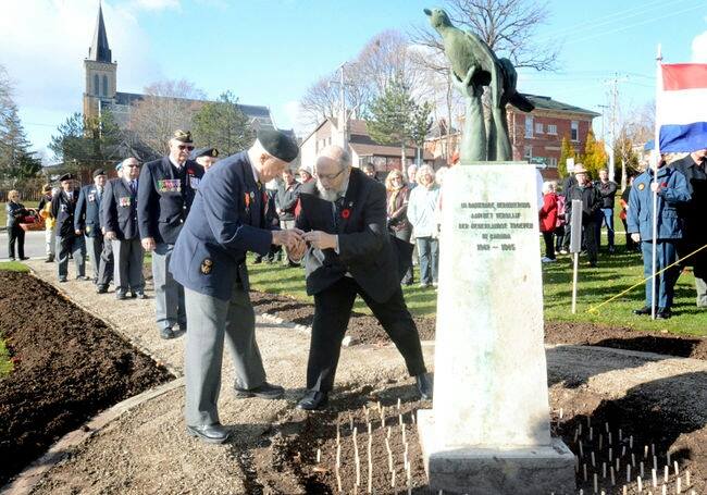 The Dutch-Canadian Friendship Tulip Garden was erected in 2015 by Stratford and District Horticultural Society, which partnered with Communities in Bloom (CIB). Horticultural Society volunteers planted an interlaced pattern of red and white tulip bulbs in the garden beds leading to the Memorial. The blooms will offer a visual reminder next spring of the link between the two countries.