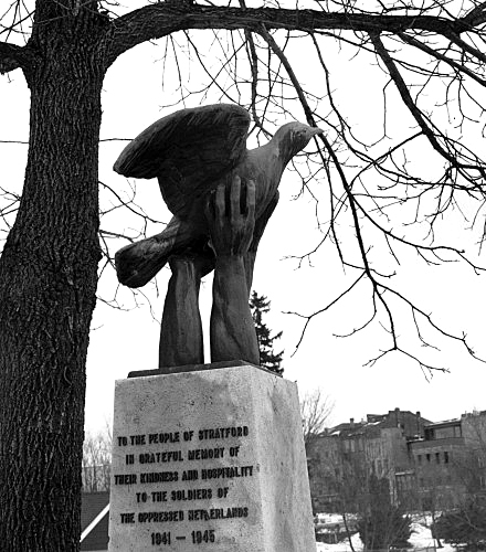 The sculpture of a pair of hands holding a dove, which is symbolic of Canada’s support to the Netherlands, marks the Canadian soldiers' successful efforts to end Nazi occupation of the Netherlands. The sculpture memorial was a gift from the Netherlands after WWII, as a token of appreciation for Stratford’s hospitality to seven hundred free men of Dutch birth who came to Stratford to form a battalion. After the occupation of Holland by Nazi armies, Canada invited free men of the world to use Stratford for a military training base. Queen Juliana of the Netherlands came four times to see them. Their Caserne or barracks was a former furniture factory on Trinity Street. For this reason and that of the participation of the Perth Regiment in the liberation of Holland in 1945, there is a close bond between our countries.