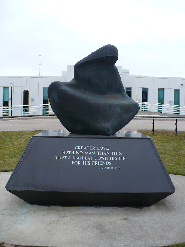This memorial is intended to be a peace memorial rather than a war memorial. The statue of a grieving mother with a child in her arms was designed by Mr. John van Boxtel, who was liberated by Canadian Forces in Holland in 1944. The figure was cast at Asten, near Arnhem, Holland. It symbolizes all the suffering of a country at war, but also hope for peace in the future.