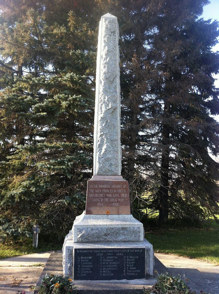The Elm Creek Cenotaph was erected in 1927 in memory of Veterans of the First World War who lost their lives in battle. A second plaque was added in 1947 for lost Veterans of the Second World War. A dedication and unveiling ceremony was held on August 17, 1947 at 2:30pm, with a parade of Legion Members of Elm Creek, and surrounding area members from Carman, Sperling, Roland, Altamont, and Miami. Delegations from three denomination Churches in Elm Creek spoke at the dedication ceremony. The Second World War plaque was unveiled by Mrs. Jessie Cochran who lost a son in the Second World War. Following the unveiling a wreath was laid on behalf of the Legion. The Cenotaph was designed and erected by Joseph Billings, owner of Carman Granite & Marble Works, Carman, Manitoba. This company is now operated by a third generation and has been in existence since 1922. Remembrance Day services are held every November 11. The Honour Roll is read and wreaths are laid by the Legion L. Auxiliary, R.M. of Grey, Village of Elm Creek, Seniors and youth of the Community. The upkeep of the Cenotaph and grounds is done by R.M of Grey and the Royal Canadian Legion, Branch No. 53, Elm Creek.