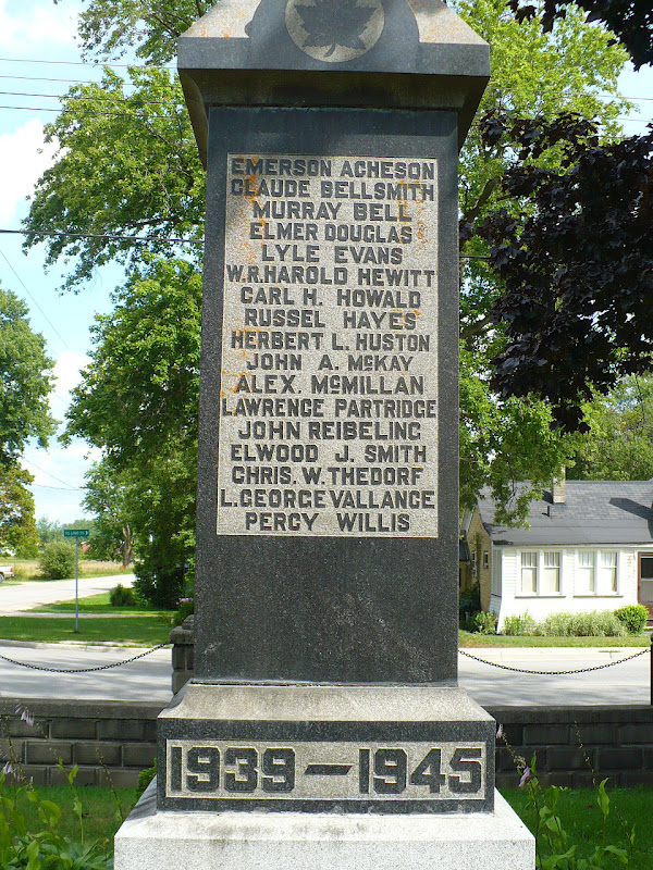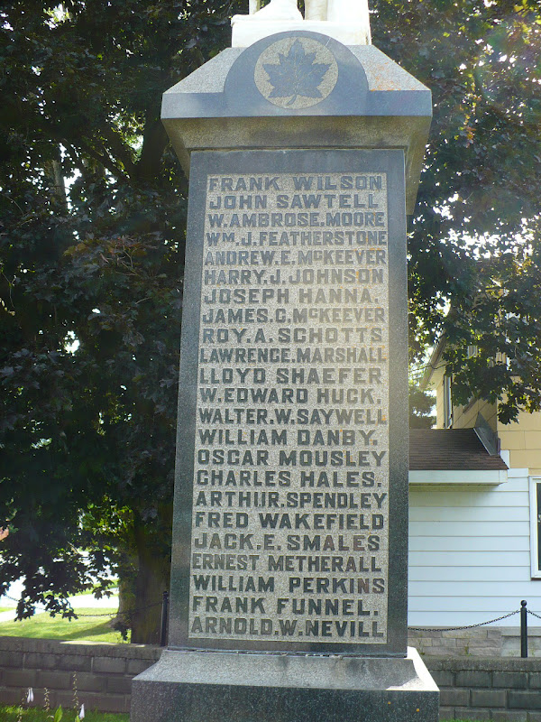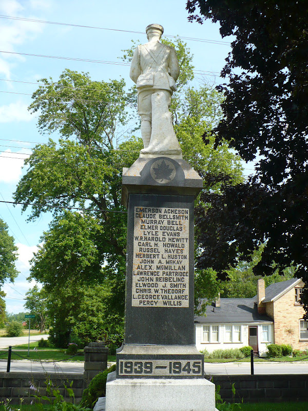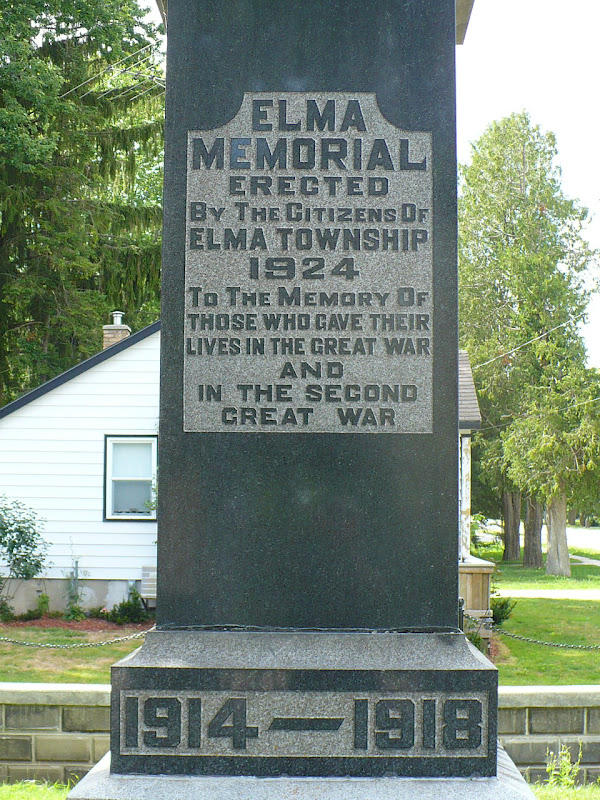 This monument is dedicated to the men of the former Elma Township, who gave their lives in the two World Wars. The memorial consists of a black granite base with the names and dedications, topped by the white marble statue of a World War I soldier.