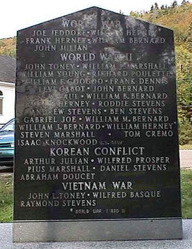 This memorial is dedicated to the Mi'kmaq servicemen who died while serving in the First and Second World Wars, the Korean Conflict and the Vietnam War.