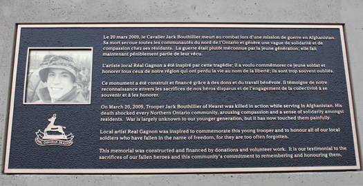 On March 20, 2009, Trooper Jack Bouthillier of Hearst was killed in action while serving in Afghanistan. His