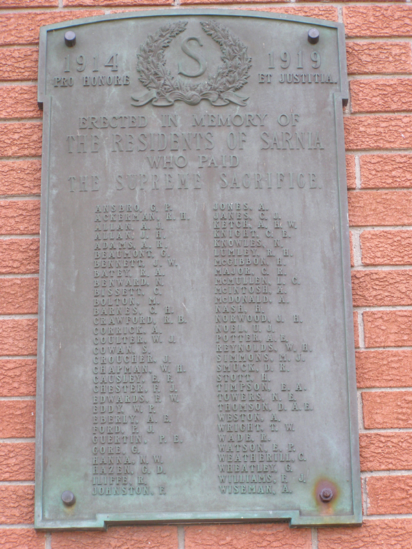 The four original bronze tablets from the Sarnia Cenotaph were removed in 1955 and re-located to the outside west wall of the Royal Canadian Legion, Branch 62.