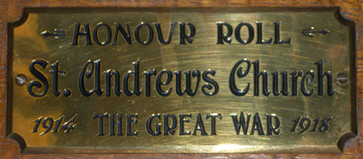 This memorial Roll of Honour erected by the St. Andrew's United Church is dedicated to its adherants who gave their services to the British empire in the First World War.