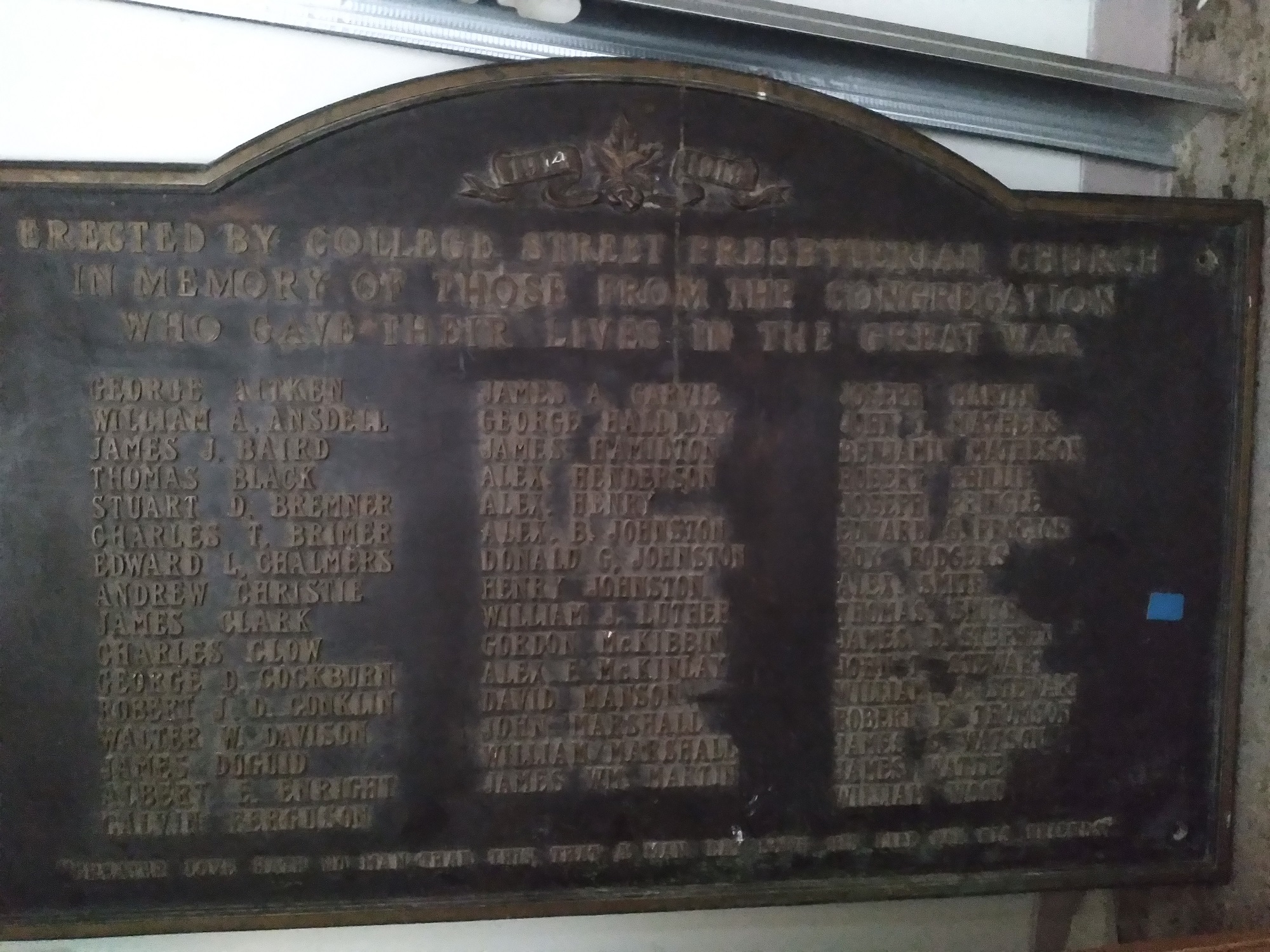 On June 27, 1920, a bronze tablet was unveiled honouring College Street Presbyterian Church parishioners who gave their lives in the First World War. The tablet was unveiled by Mrs. Alex Stewart whose two sons died in the war. The congregation joined the United Church in 1925.