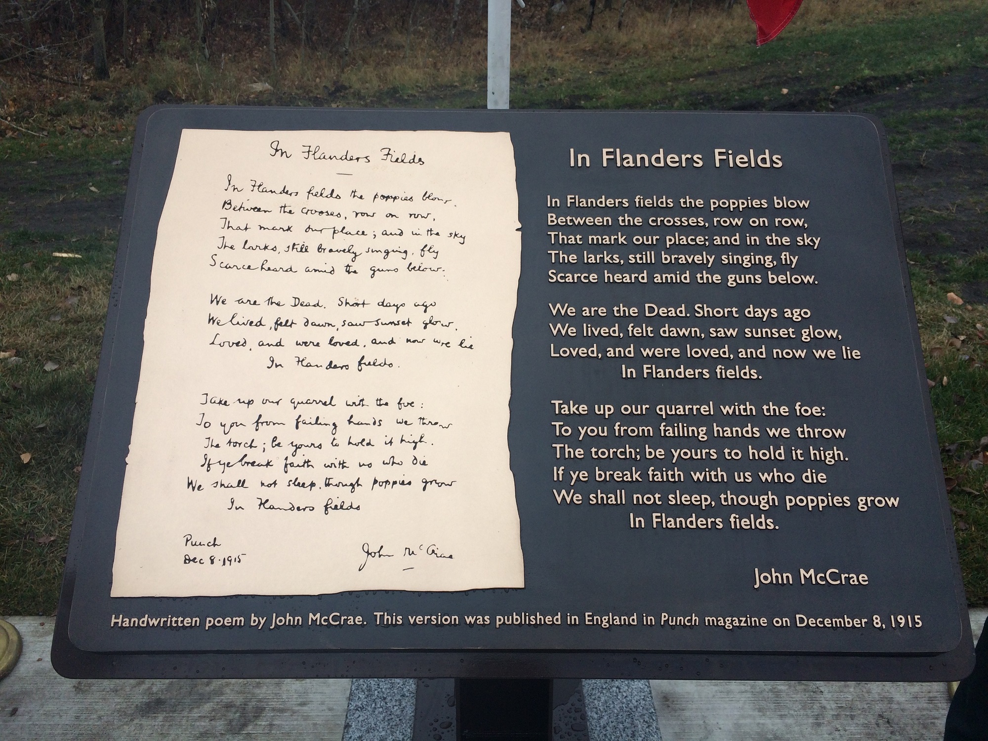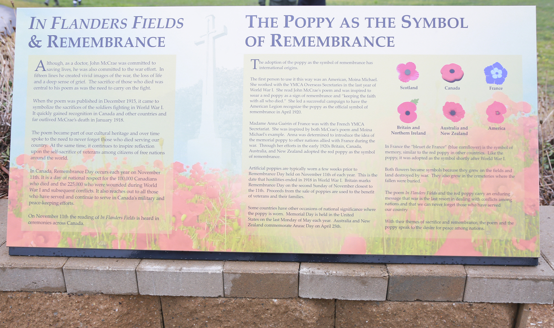On November 1, 2015, the park was officially dedicated to commemorate the 100th anniversary of the famous war poem, In Flanders Fields. The park features unique walkways and walls made of brick which mimic the trenches in the First World War, poppy beds, a bronze plaque with the poem in the author’s original handwriting, a storyboard with the story of McCrae and how he came to write the poem and another storyboard with the story of how the poem itself became tied to remembrance and the poppy became the symbol of remembrance.