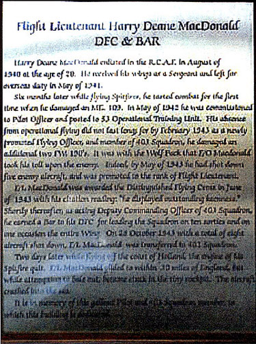 This memorial is dedicated to Flight Lieutenant Harry Deane MacDonald. It was erected by the 403 Squadron.