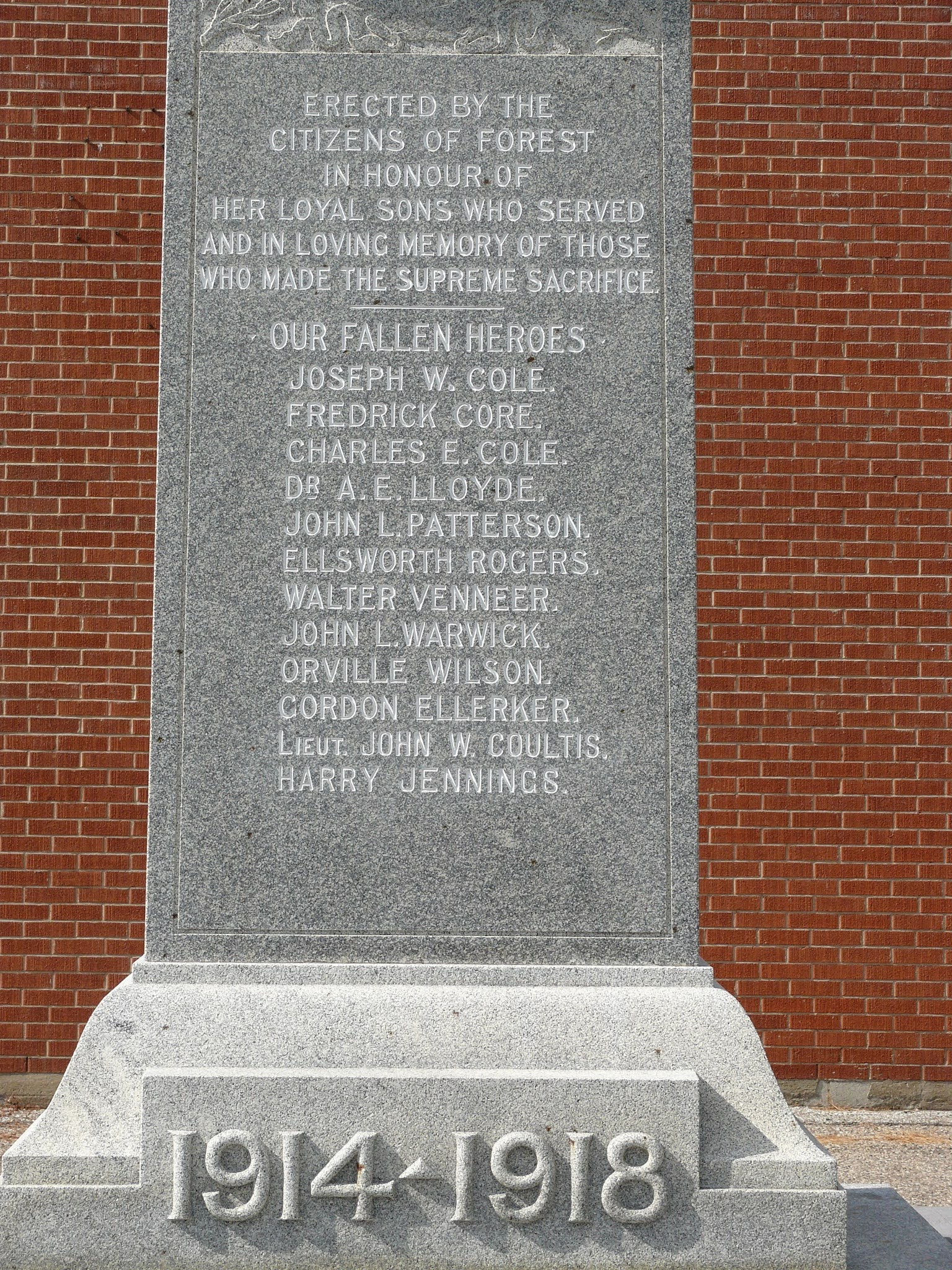 The figure of a soldier by the Community Hall in Forest is sculpted from Italian marble. It is one of many in Canada that were crafted in Europe. The fine stone is much prized for sculpture and comes from the same area as the marble that Michelangelo worked. Source: "By Little Towns" booklet by Robert Shipley