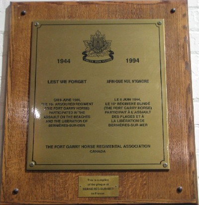 This plaque, a replica of the original placed at the Canadian memorial at Bernières-sur-Mer in France, was donated by the Fort Garry Horse Regimental Association. It is dedicated to the members of the regiment who participated in the Normandy landings and the liberation of Bernières-sur-Mer.