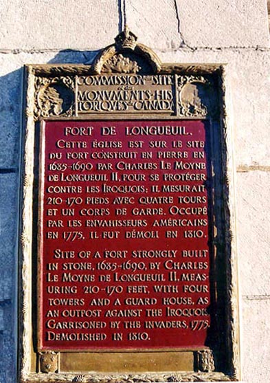 This plaque, set on the Church of Saint-Antoine de Longueuil by the Historic Sites and Monuments Board of Canada in 1925, commemorates Fort Longueuil which was built on this site in 1685-1690 by Charles Lemoyne de Longueuil as an outpost against the Iroquois. Occupied by the Americans in 1775, it was demolished in 1810.