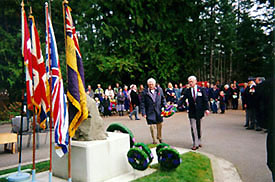 In November 1994 all the known island ex-service veterans, about 45, were contacted by telephone and invited to meet at a local hall to discuss the possibility of erecting a monument. This meeting, which was held about two weeks later with 30 veterans present, supported the concept of a monument. A committee of eight volunteers was organized to make investigations in respect to location, size, type, composition and funding. At this meeting it was also decided that this monument should be a Cairn rather than a Cenotaph, and that the project would be called the "Gabriola Memorial Cairn". In February 1995 a second meeting was called to hear committee recommendations and to discuss the project in general. At this meeting the following was determined: the location was suggested as being placed on the lawn of the Royal Canadian Mounted Police detachment's office, other locations were discussed but rejected for various reasons. Composition would be a 4` x 4` x 4` concrete base and would be mounted on an island sandstone of appropriate size. The sandstone should be flat on one side so that a bronze and cooper plaque could be mounted on it and the Cairn was not to be more than 6 - 6.5` in height. After much discussion it was decided that the plaque should bear the Veteran Affairs Canada "Canada Remembers" logo. The veterans stated that the Cairn should be for all who served and not just for those who served overseas or at home in the Armed Forces. Many citizens served Canada in other important facilities, such as, hospitals, shipyards, aircraft and munitions factories. The veterans also thought it would be most appropriate for the Cairn to be unveiled and dedicated on the 50th Anniversary of VE Day, May 8, 1995. Since only a handful of island veterans were members of service organizations, such as, the Royal Canadian Legion and the Royal Canadian Naval Association and since there was no Gabriola Island veterans' organization, it was decided that the project funding would be by individual donations from veterans, and the sale of "Canada Remembers" lapel pins. The Gabriola Lions Club were also to be approached for funding. In March 1995 various tasks were allotted to committee members and after several meetings, the project began to take shape. The Royal Canadian Mounted Police were most co-operative and kindly arranged for the Cairn to be placed on their property. A suitable sandstone was found after much searching. The plaque was then ordered while local trades people volunteered to provide gratuitously both labour and material. The Veteran Affairs Canada members provided the lapel pins which veterans sold around the island. These proved to be a very popular item and after selling 800 there were no more available. In general, support from the community was most gratifying. Invitations to attend were sent out to Federal, Provincial and local government politicians, Royal Canadian Mounted Police Divisional HQ and to the Gabriola Elementary School, plus the local Scouts Troop. In April 1995 volunteer veterans commenced to dig the Cairn's foundation. Over the next two weeks the concrete was poured with a maple leaf etched into the surface at each corner. After a week, to allow the concrete to harden, the sandstone was craned into place and anchored to the base. On May 1, 1995, the plaque was professionally inserted into the sandstone. The whole project was then draped with a tarpaulin to keep rain off, and away from prying eyes. The program was sent for printing and the Gabriola Volunteer Fire Department offered to hose down the roadway and paths around the Cairn two days before the ceremony. On May 8, 1995, the Unveiling and Dedication Ceremony was held. The unveiling was performed by Senator Ray Perreault on behalf of the Federal Government, Ms. June Bobbie on behalf of Veterans Affairs Canada, Ted Krell representing service veterans and "All Who Served", and Joe Davis representing Gabriola's pioneers and present day residents. Reverend Donald Gordon, a former RCNVR, performed the dedication and conducted the service that followed. It was estimated that 40 veterans and 400 members of the community, population 3000+, attended. Veterans and the public were welcomed, and dignitaries were introduced by the Carin Committee's Chairperson, Peter Eastick, former RNVR. Eastick stressed the importance of "never forgetting" the sacrifices made by the men and women of our Armed Forces during the First and Second World Wars and the Korean conflict. During the playing of "Reveille" a fly-over was made by a Second World War Harvard (trainer) aircraft flown by Phil Kalnin. The pilot flew several passes over the area, as each time he dipped his wings in salute. Following the ceremony, dignitaries and guests were entertained to a light luncheon at the nearby Agricultural Hall. Other ceremonies at the Cairn have included: August 13, 1995 - 50th Anniversary of VJ Day at the end of the Second World War November 11, 1995 - Remembrance Day May 5, 1996 - "Battle of Atlantic" Sunday November 11, 1996 - Remembrance Day May 4, 1997 - "Battle of the Atlantic" Sunday November 11, 1997 - Remembrance Day