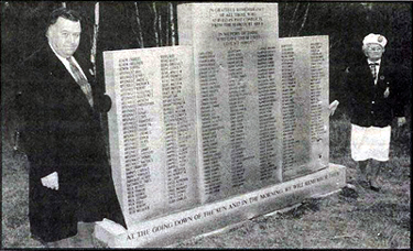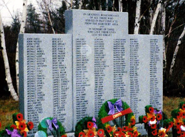 Erected by the Ladies Auxiliary of Royal Canadian Legion Branch No. 75, this memorial is dedicated to all local veterans and war dead. The memorial was erected by Heritage Memorial Ltd. Windsor, NS, Ruth Fahey a Ladies Aux. member was the one who had the idea to have a memorial erected at our Legion. Susan Petley (President at the time) advertised with flyers and the media for names of the deceased service men and women in the area. They soon had 250 names. The memorial they had ordered was to hold 100 names. They had to order two wings to accommodate the other names. They were granted funding from the Provincial Government, NB Command Community Services Fund, and donations. The cost of the memorial was $3975, The unveiling was on November 11, 1995 by Susan Petley and Alan Graham. Approximately 250 people were present. The Poppy Chairperson Sheila Handrahan delivers the Memorial Service each year on Remembrance Day to a packed Legion.