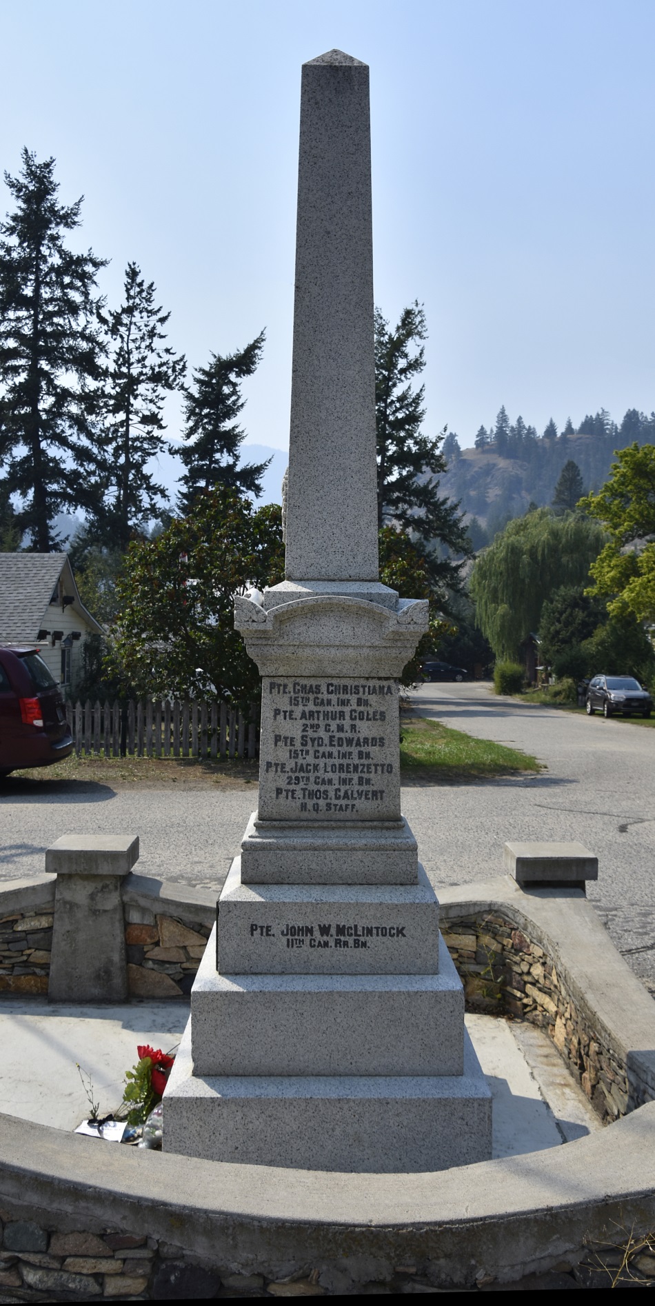 Six of the men on the cenotaph are from the 54th Kootenay Battalion and of those, five were from the original group of 17 who signed up together. When these 17 men left Hedley on August 24, 1915, they gathered at the exact location of the future cenotaph and had a group photo taken. There was a big send-off. All the townspeople gathered, the children were let out of school and the town brass band played. The recruits left Hedley in a caravan of vehicles draped with banners which read, "Recruits from Hedley, the Machine Gun Town."