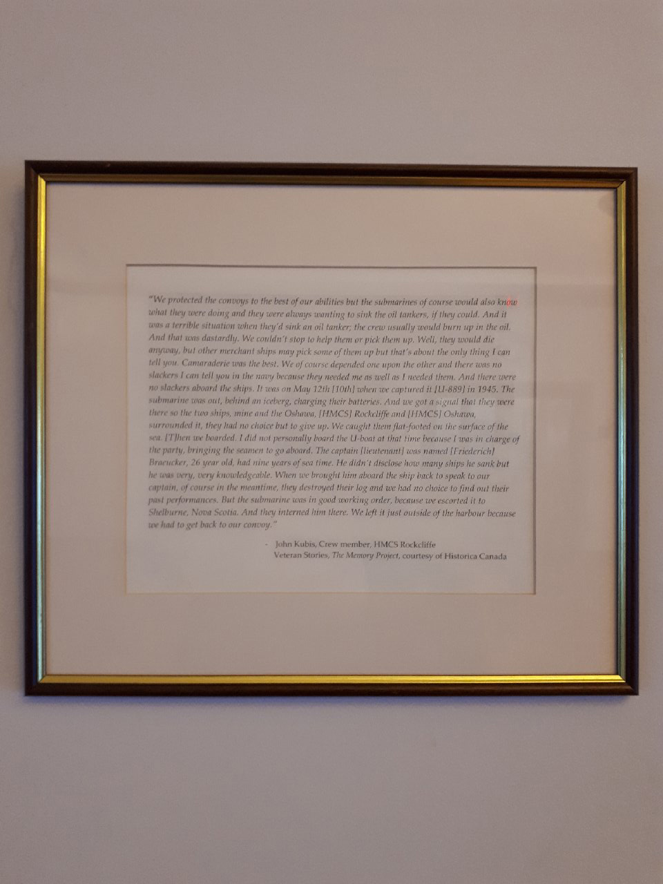 "We protected the convoys to the best of our abilities but the submarines of course would also know what they’re doing and they were always wanting to sink the oil tankers, if they could. And it was a terrible situation when they’d sink an oil tanker; the crew usually would burn up in the oil. And that was dastardly. We couldn’t stop to help them or pick them up. Well, they would die anyway but other merchant ships may pick some of them up but that’s about the only thing I can tell you. Camaraderie was the best. We of course depended one upon the other and there was no slackers I can tell you in the navy because they needed me as well as I needed them. And there was no slackers aboard the ships. It was on May 12th [10th] when we captured it [U-889] in 1945. The submarine was out of, behind an iceberg, charging their batteries. And we got a signal that they were there so the two ships, mine and the Oshawa, [HMCS] Rockcliffe and [HMCS] Oshawa, surrounded it, they had no choice but to give up. We caught them flat footed on the surface of the sea. When we boarded the, I did not personally board the U-boat at that time because I was in charge of the party, bringing the seamen to go aboard. The captain [lieutenant] was named [Friederich] Braeucker, 26 year old, had nine years of sea time. He didn’t disclose how many ships he sank but he was very, very knowledgeable. When we brought him aboard the ship back to speak to our captain, of course in the meantime, they destroyed their log and we had no choice to find out their past performances. But the submarine was in good working order, because we escorted it to Shelburne, Nova Scotia. And they interned him there. We left it just outside of the harbour because we had to get back to our convoy."