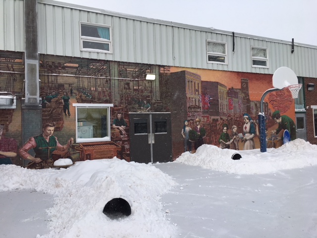 The Boys and Girls Club received a grant from the Minister of Canadian Heritage’s World War Commemoration Community Fund in 2015. Allan Bender and John Nobrega of Blinc Studios were commissioned to paint a series of narrative murals entitled “The Home Front”.