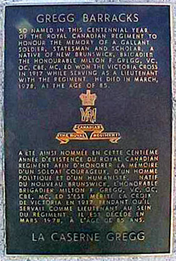 This memorial is dedicated to Brigadier, The Honourable Milton F. Gregg, VC, OC, CBE, MC, ED. It was erected by the Royal Canadian Regiment.