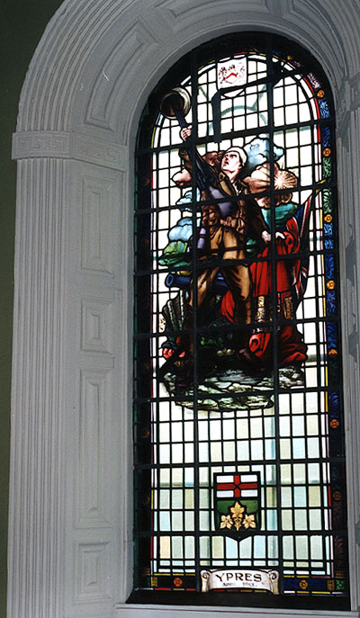 The cartoon from which this window was made is by Bernard Partridge and appeared in “Punch” shortly after the second battle of Ypres. It was at the Battle of Ypres when the Germans for the first time used their deadly gases, and the Canadians by their unparalled courage barred the way to Calais, and brought great honour not only to Canada but to the British Empire.