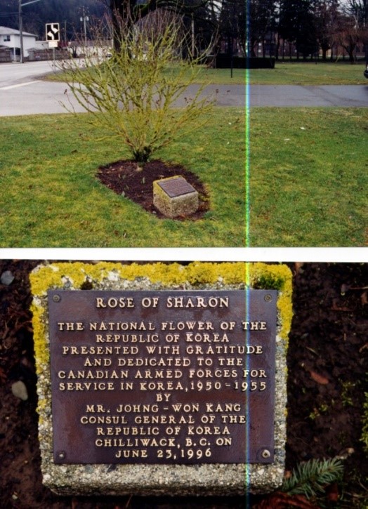 A dedication stone and “Rose of Sharon” bush (Korea’s National Emblem) is found in the vicinity of the All Sappers’ Cenotaph. Dedicated on 23 June 1996. This memorial honours the Canadian veterans of the Korean Conflict.
