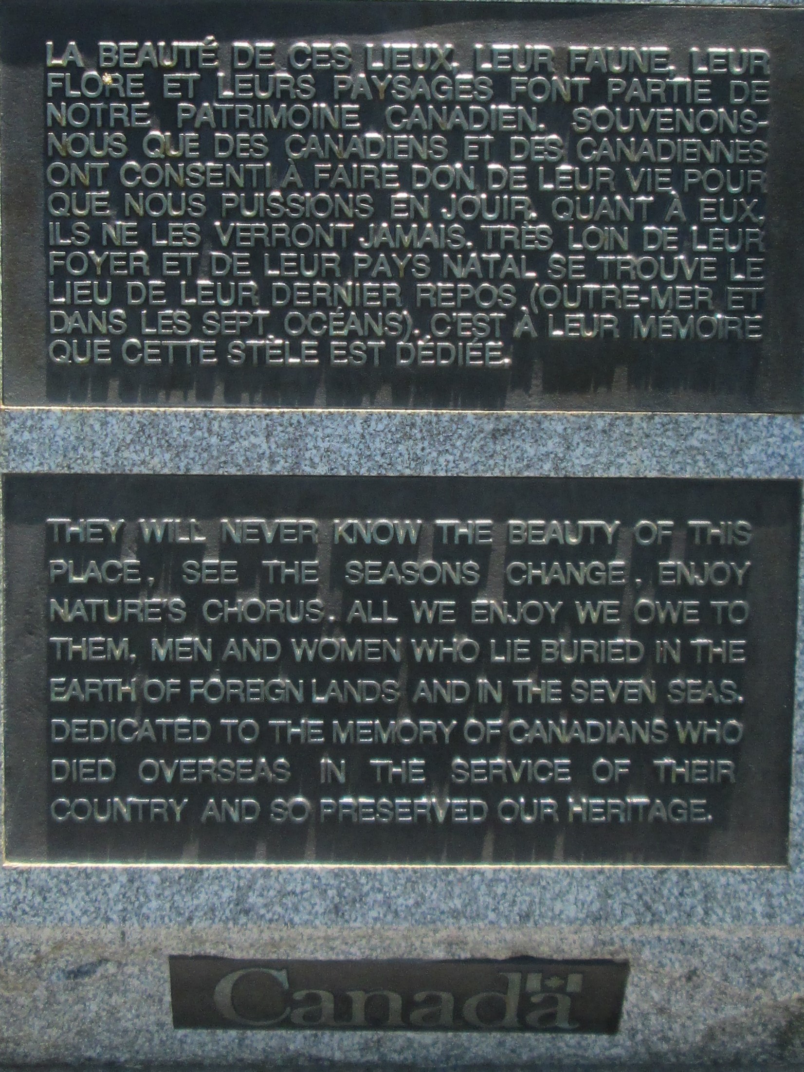 La beauté de ces lieux, leur faune, leur flore et leurs paysage font partie de notre patrimoine canadien. Souvenons-nous que les Canadiens et Canadiennes ont consenti à faire don de leur vie pour que nous puissions en jouir. Quant à eux, ils ne les verront jamais. Très loin de leur foyer et de leur pays natal se trouve le lieu de leur dernier repos (outre-mer et dans les sept océans). C’est à leur mémoire que cette stèle est dédiée.