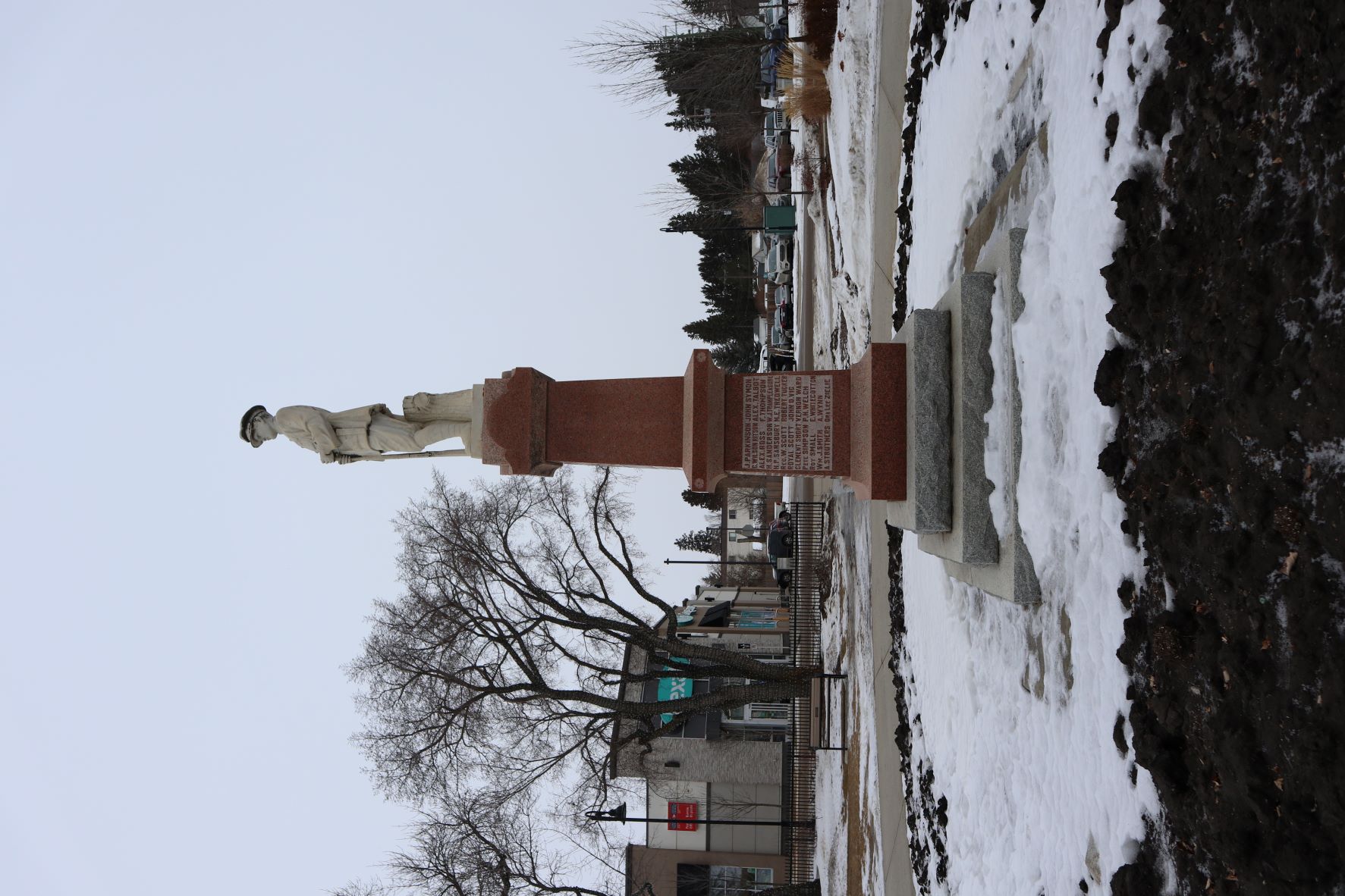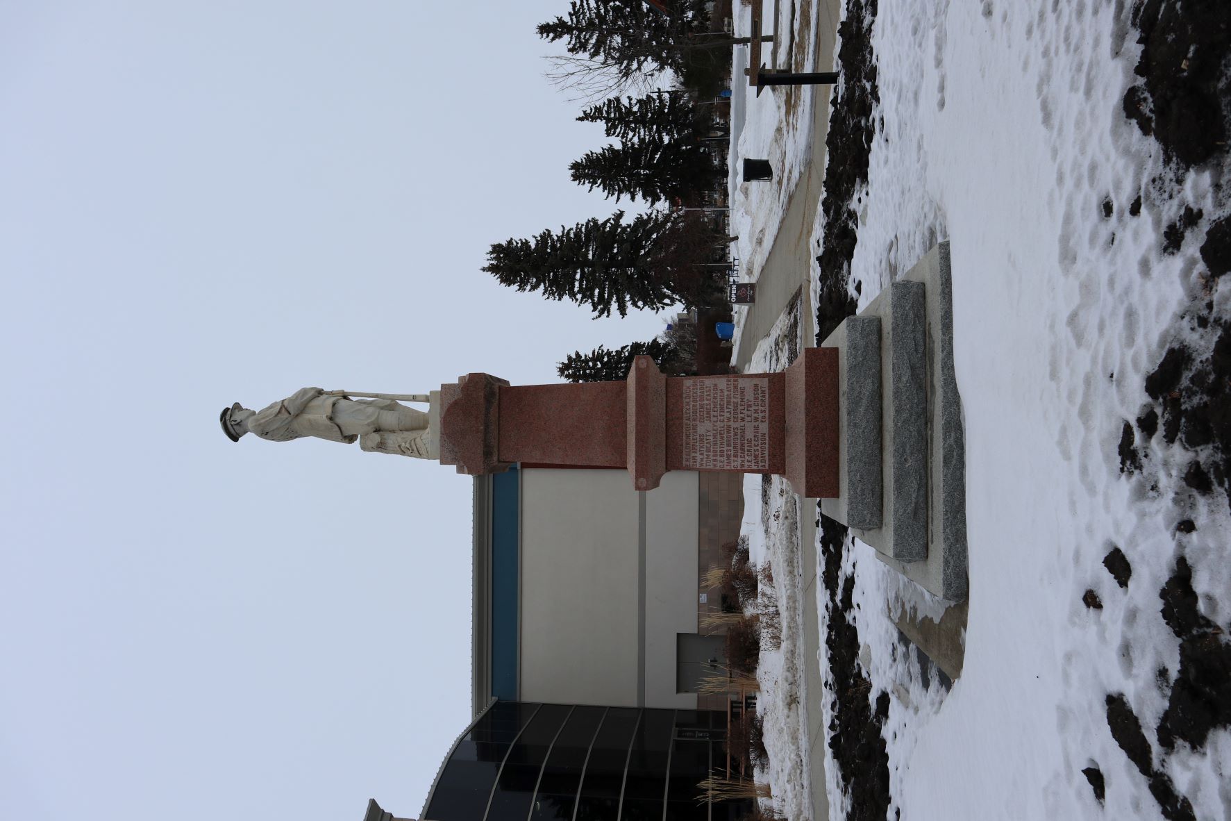 The young soldier stands tall, chest out, holds the barrel of his rifle and gazes solemnly to the south. He is dressed as soldiers often were in the photos taken after enlistment for their families. It was designed by Albert J. Hart, owner of Albert J. Hart, Marble and Granite Works. Located in Calgary, it was one of the oldest marble and granite works in that city. Hart was a skillful and fair businessman who was an expert cutter and designer. He designed several cenotaphs across Canada including those for the City of Medicine Hat and the Town of Nanton.