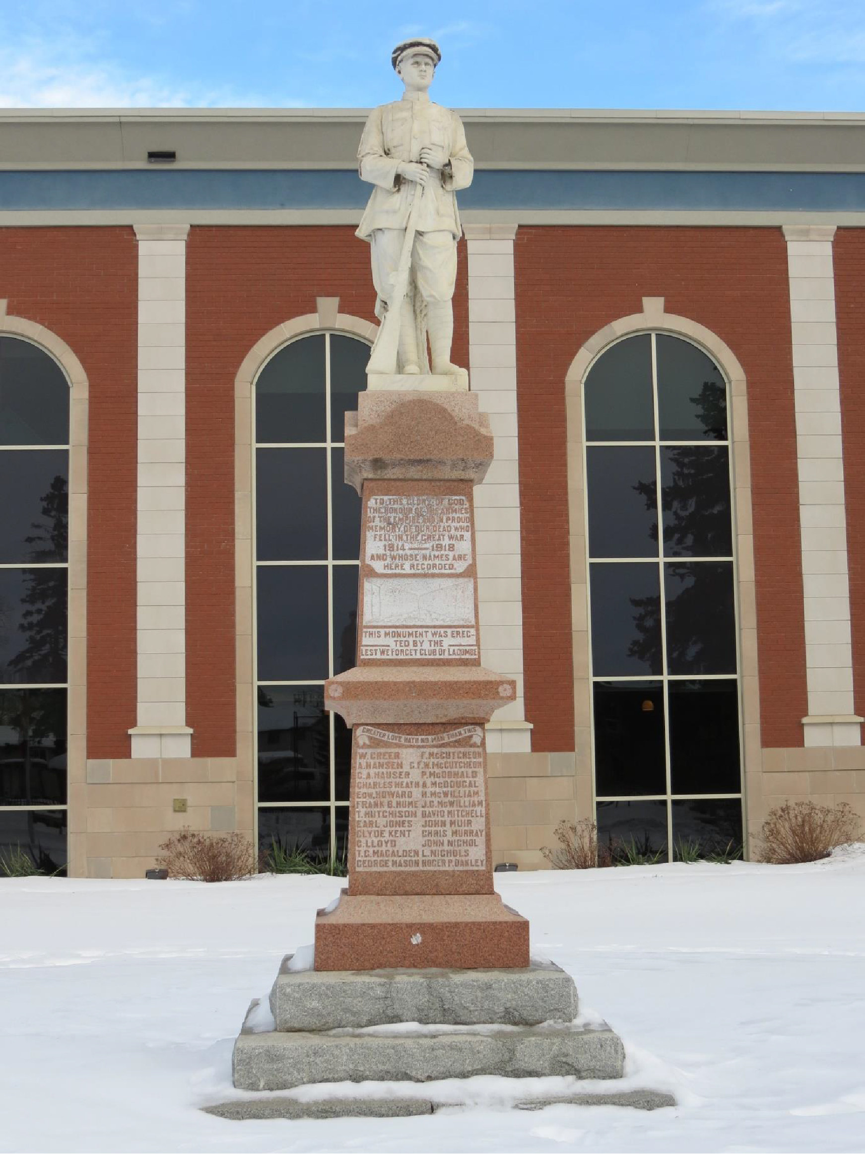 The Lacombe Cenotaph was erected in the Lest We Forget Park in 1924 by the Lest We Forget Club. The Club was composed of a group of dedicated widows, wives, mothers, daughters, and sisters of Veterans of the First World War. The Club raised money for the cenotaph through a fair with tea cup readings; silver tea and bake sales combined with concerts and fortune telling; and dances. A concert by local artists was held in the Vet theatre in October of the same year. McDonald Nurseries donated the plantings surrounding the cenotaph.