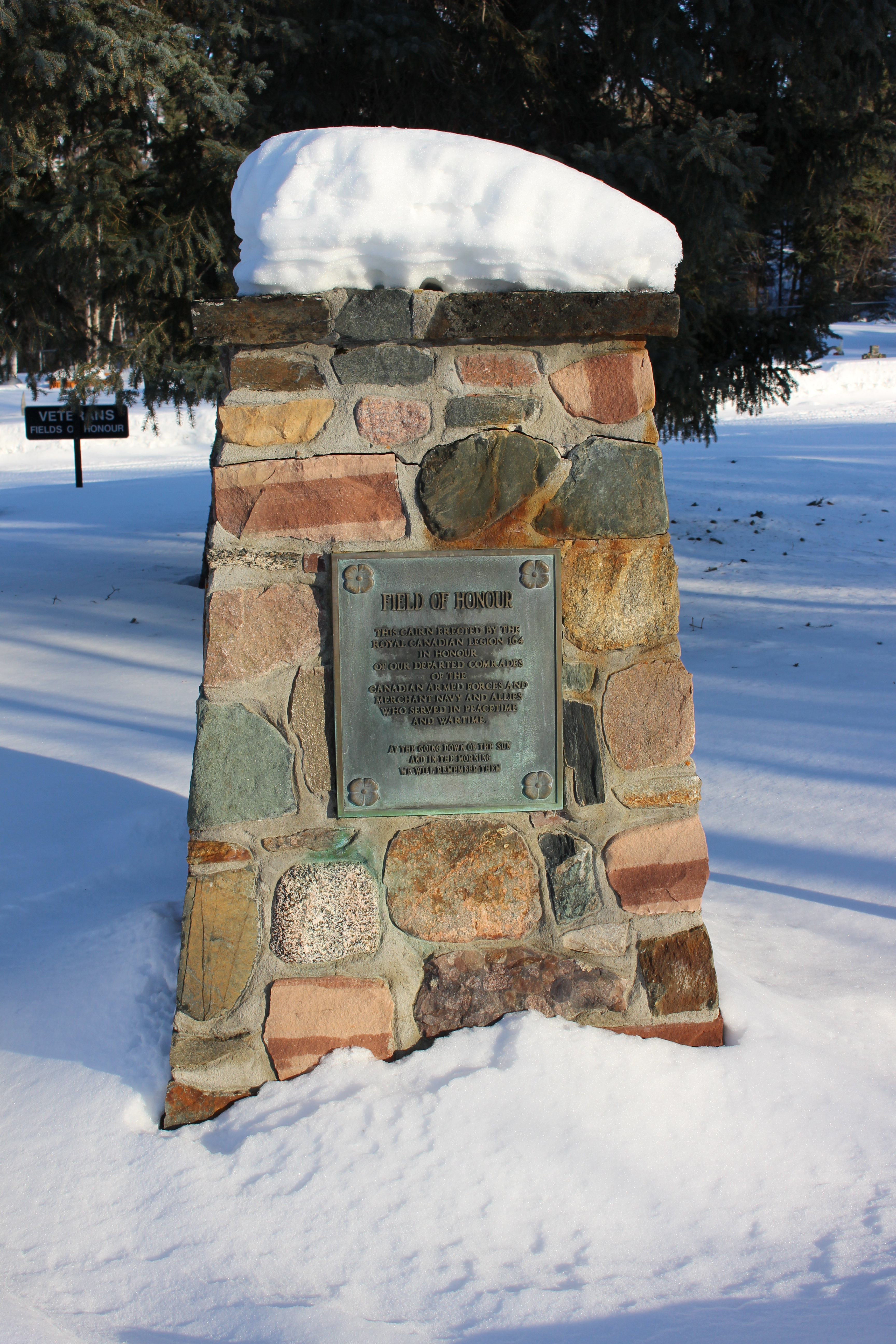 Block 9-A is the Veterans Fields of Honour where rows 1-12 reserved for the Royal Canadian Legion as per Yellowknife By-law No. 3965, adopted March 25, 1997. The cairn is four sided, made of rocks and tapers from smaller to larger, from top to bottom. The top of the cairn is comprised of flat stones that overhangs the edges. The cairn has a metal plaque on the front and contains poppies in each of the four corners. The date of the monument is unknown.