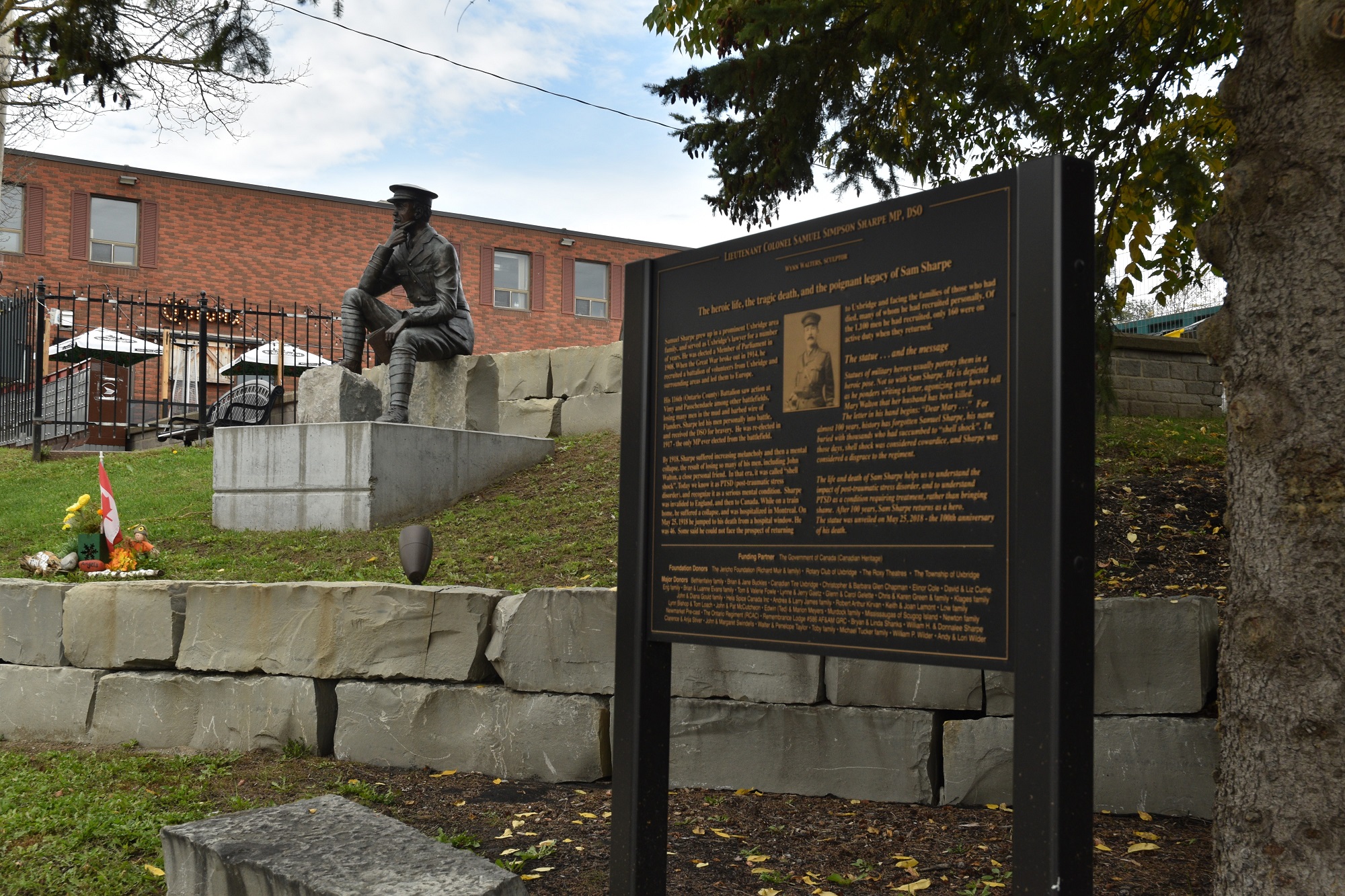 Lieutenant Colonel Samuel Sharpe was honoured on May 25, 2018, the 100th anniversary of his death, with the unveiling of a life-size statue. The statue was funded partly through community donations, the Rotary Club of Uxbridge and the Uxbridge-Scott Historical Society. Created by sculptor Wynn Walters, the statue of Sharpe is depicted as he ponders writing a letter, agonizing over how to tell Mary Walton that her husband had been killed. The letter in his hand begins: "Dear Mary..."