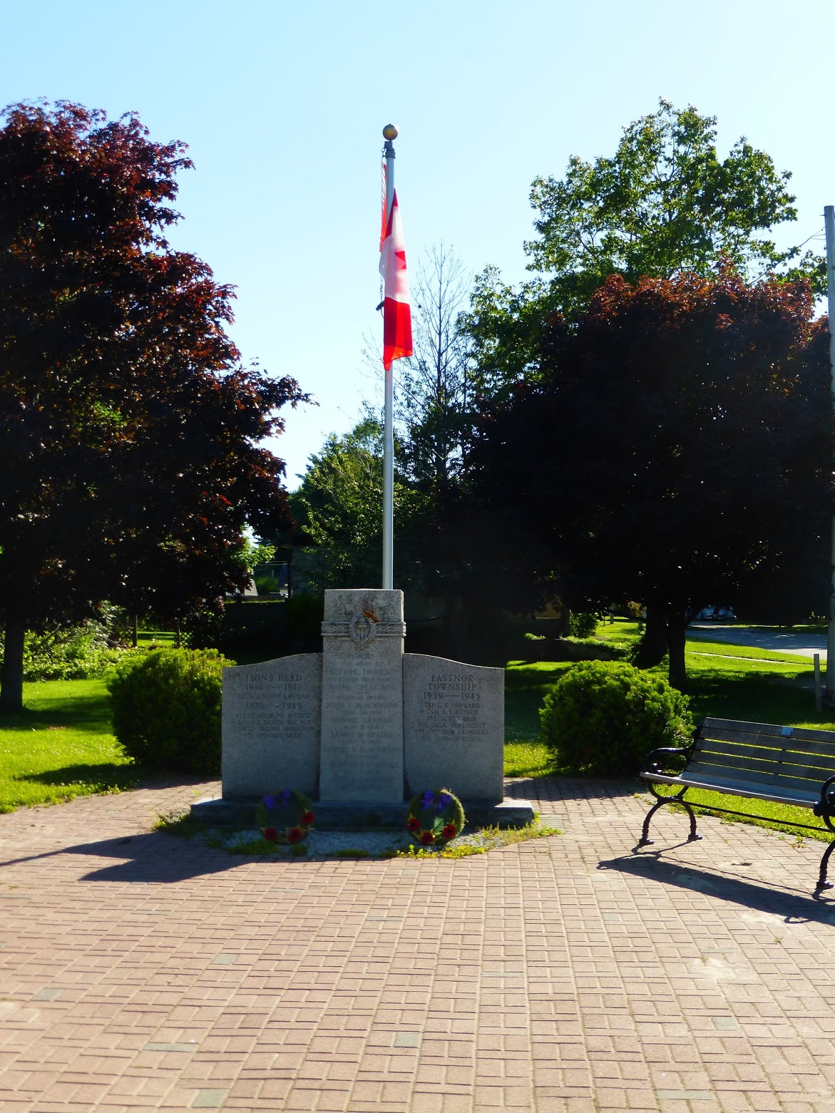 In May of 1924 the Monument was moved from that location and placed in front of the Eastnor Township Hall (now the Rotary Hall). In 1929 The Eastnor Horticultural Society purchased four village lots from the Tackaberry sub-division across the road from the Township Hall and established the Memorial Park. In March of 1931 the Monument was moved once again to its present location in the Memorial Park.