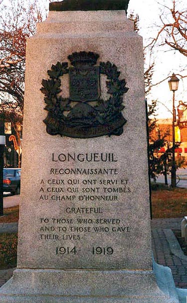 Sculpted by M. Emile Brunet, this memorial was erected in 1923 on behalf of the city of Longueuil in honour of the local war dead and veterans of the First World War. A plaque was later added for the local participation in the Second World War.