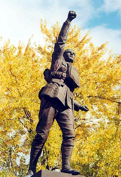 George Hill’s monument at Magog features a statue of a triumphant Canadian soldier who is bare-headed, the raised right hand clutches a Mills bomb, the left fist is clenched. The Canadian Tommy has triumphed, he has come though, he rejoices in the thrill of victory.