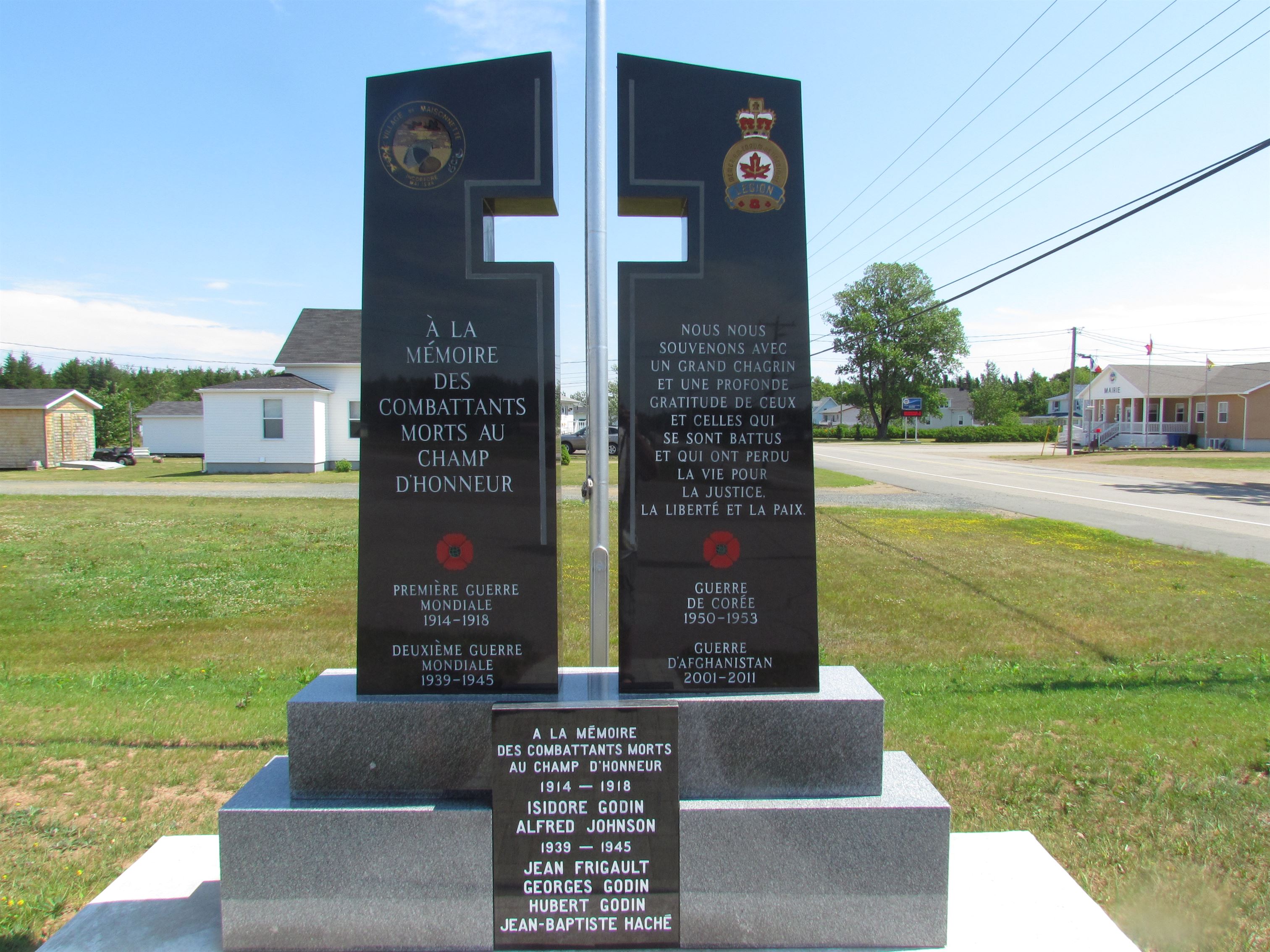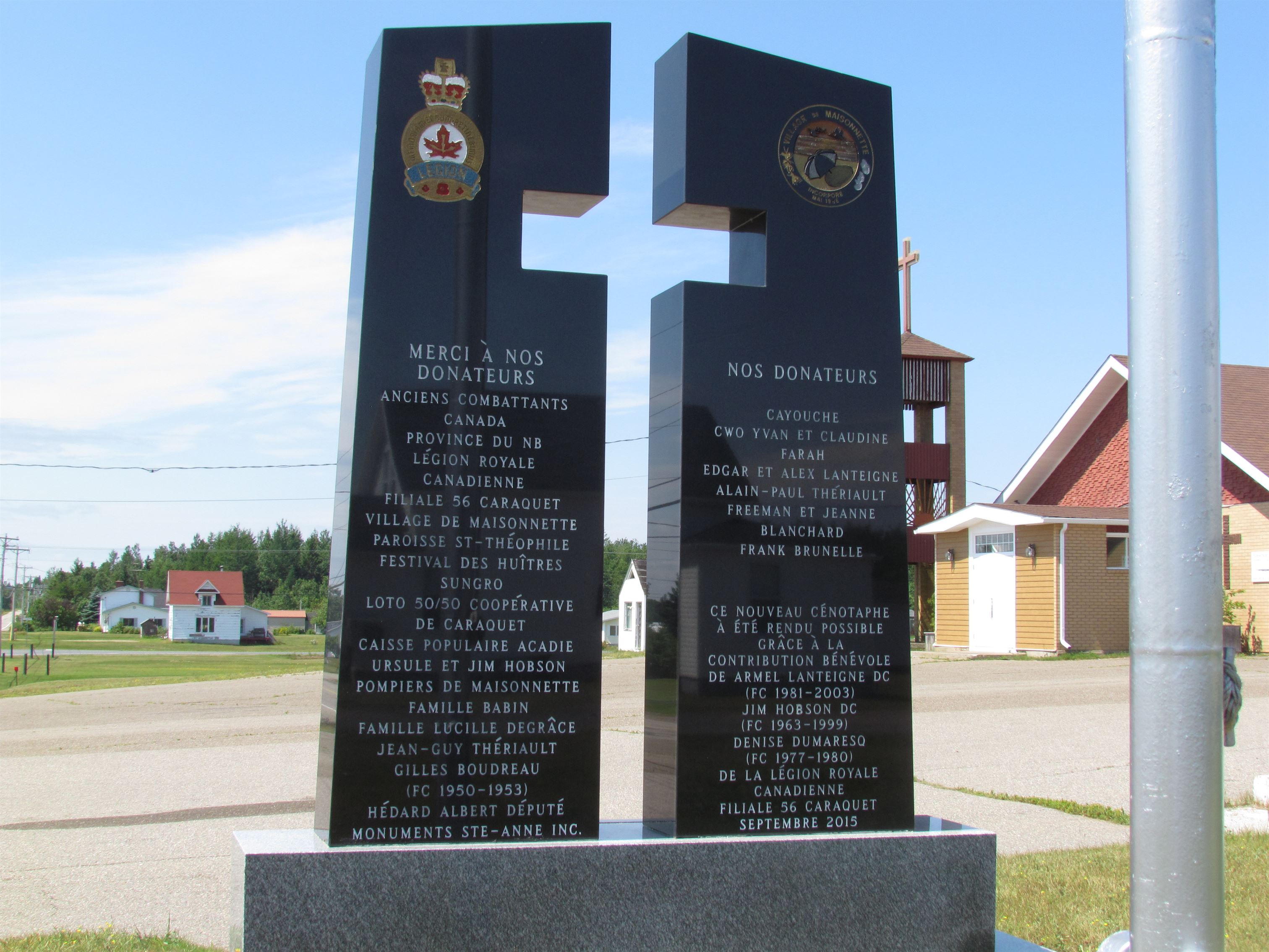 This new cenotaph has been erected in September 2015 by Armel Lanteigne, President of the Royal Canadian Legion Caraquet Branch No. 56, assisted by Jim Hobson(Member) et de Denise Dumaresq (Treasurer). The cenotaph was built by Monument Ste-Anne, from Bertrand, and is dedicated to all war dead. The war in Afghanistan has been added to this new memorial.