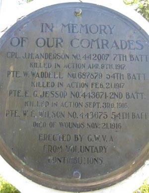 After the First World War in 1924 the "The Eagle River Valley Branch" of the G.W.V.A. No. 64 erected a cenotaph at Malakwa's Cemetery to commemorate those who had given their lives for peace. The Cenotaph was built by community volunteers and the property for the Cenotaph was donated by Mr. and Mrs. McGlone. This memorial is dedicated to the local war dead of the First World War (1914-1918), the Second World War (1939 - 1945) and the Korean War (1950 - 1953).
