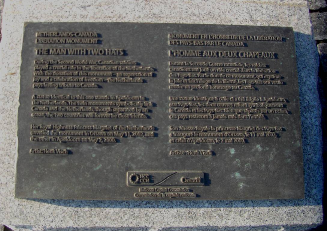 The Ottawa Man with Two Hats monument is a replica of the statue found in the Dutch city of Apeldoorn named De man met de twee hoeden. The twin statues exemplify the strong ties between the Netherlands and Canada. The friendship that bonds the two countries grew during the Second World War, when Canadian soldiers played an important role in the Liberation of the Netherlands.