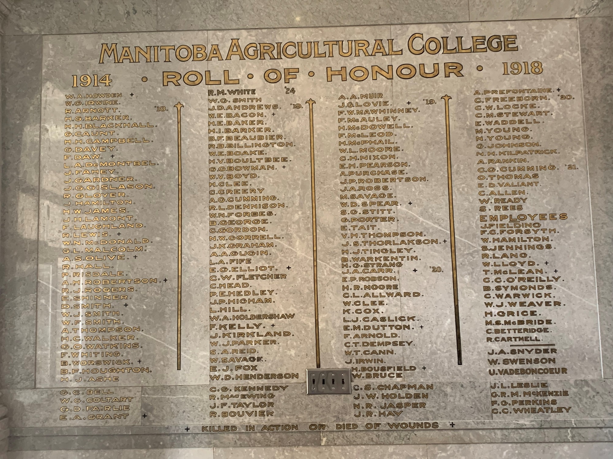 The names of University of Manitoba students and staff who served in the First World War were painted directly on the walls of the university's Administration Building, formerly the Manitoba Agricultural College. The gilded gold lettering is attributed to renowned Canadian artist Lionel LeMoine FitzGerald.