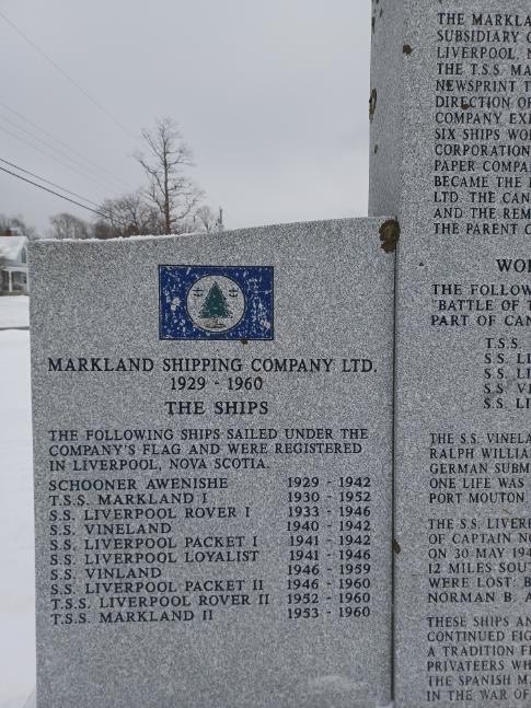 The Markland Shipping Company Monument was dedicated on September 7, 2002. The Markland Shipping Company was a steamship company located in Liverpool from 1929 until 1959. Markland Shipping was a subsidiary of the Mersey Paper Company which employed seamen from Queens, Lunenburg and Shelburne counties. During the Second World War, five ships of the Markland Shipping Company and crew were used by the Canadian government to carry cargo. The location of the monument looks out to the wharf where the vessels once docked.
