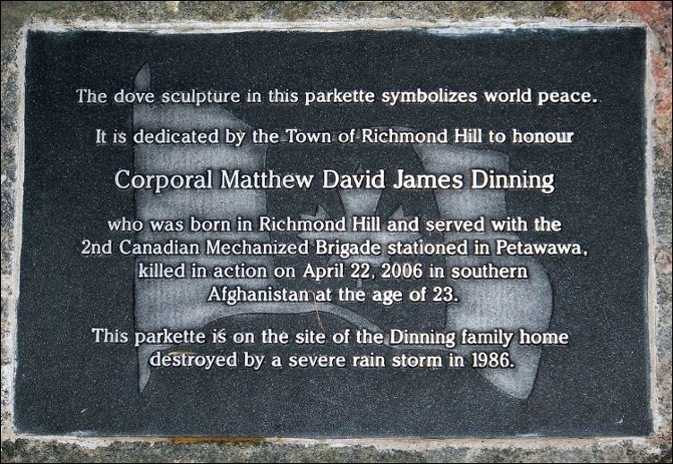 This park is named in memory of Corporal Matthew Dinning. It was unveiled on July 12, 2008 by the Town of Richmond Hill.