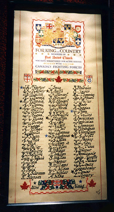 This memorial is dedicated to the Members of the First United Church. It was erected by the Members of the First United Church.