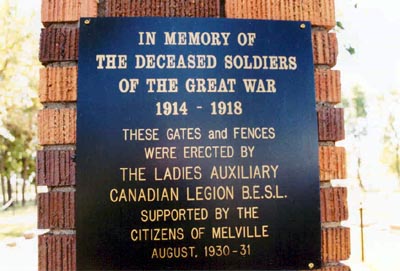 Erected in 1930-31 by the Ladies' Auxiliary of the Canadian Legion, British Empire Service League and the citizens of Melville, this memorial is dedicated to the war dead of the First World War.