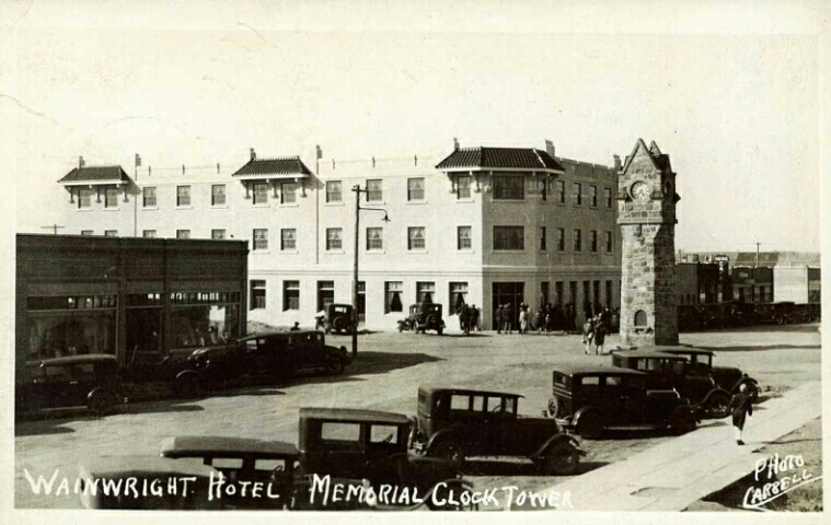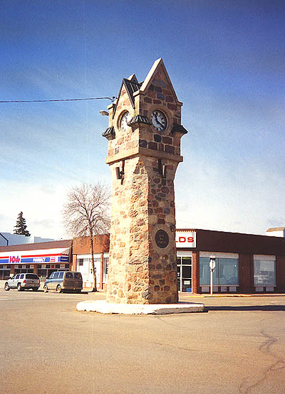 In 1925, the memorial clock was dedicated by the Walter Musson Charter, The Imperial Order Daughters of the Empire, to the men that fought and were lost in World War I. Mr. Frank Balley was the stonemason who built this tower and also did the architectural design for it. The stones were gathered by the school children from town and also farmers bringing in some when they came to town. They say most of the rocks that the school children gathered were from Norman Cooper's farm a little ways east of town. The clock that was installed into this Cenotaph came from England and was run from batteries until the main street was paved in 1958-1959 when it was changed over to electric.