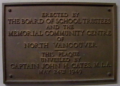 This Memorial Community Recreation Centre erected by the Board of School Trustees and the Memorial Community Recreation Centre of North Vancouver was unveiled by Captain John H. Cates, M.L.A. on May 24th 1949.