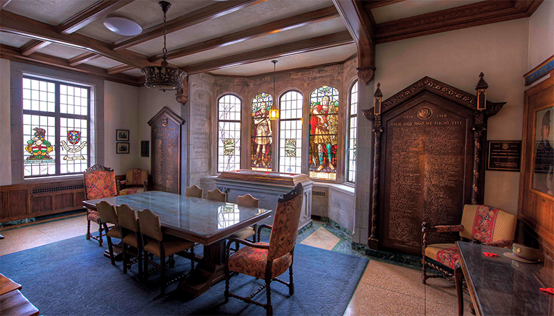 The Memorial Room commemorates the 351 Queen's students and alumni who died in the First and Second World Wars. It features two large bronze plaques inscribed with the names of those who died, a stone altar, stained glass windows, and seven oil paintings of men and women from each branch of the Canadian Forces, painted by Toronto artist Marion Long.