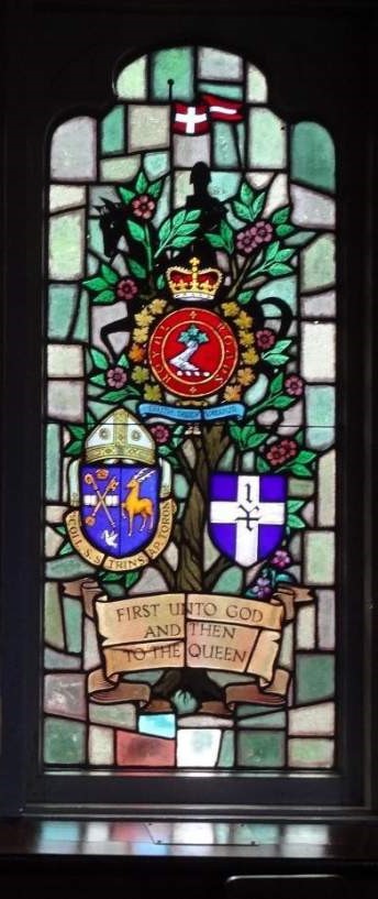 This window is dedicated to the memory of Michael F. A. Ney, who was killed in an accident in Kenya on October 31, 1954, while serving as an inspector with the Kenyan Police Force. The window design includes crests of the Royal Roads Military College and of Trinity College at the University of Toronto, and the message “First unto God and then to the Queen”.