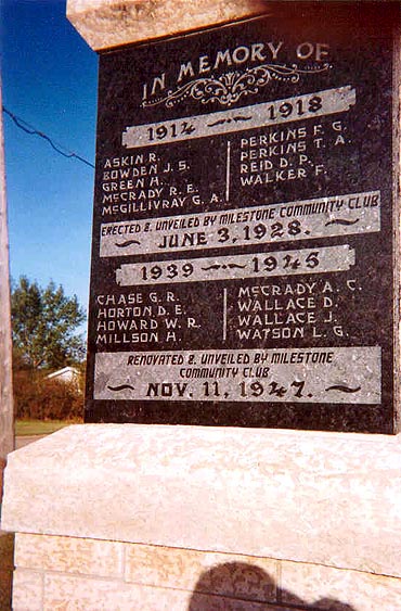 Erected by the Milestone Community Club on 3 June 1928, this memorial to the local war dead of the First World War was rededicated on 11 November 1947 to include the local war dead of the Second World War.