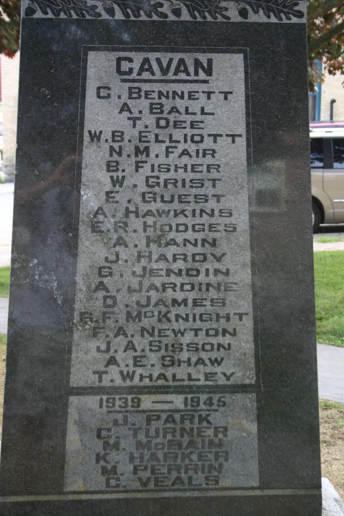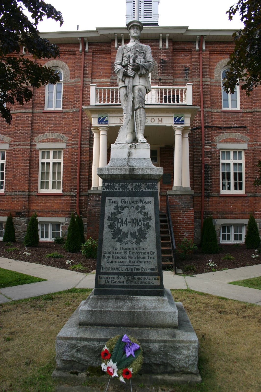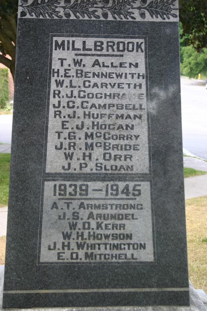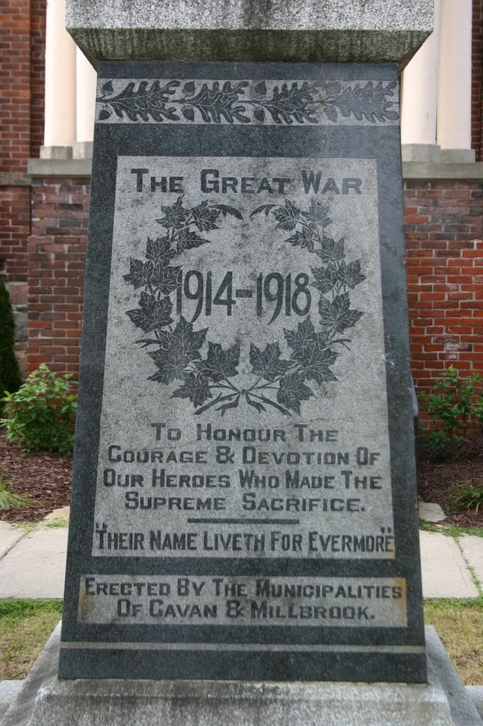 The Millbrook Cenotaph was erected soon after the Great War by the municipalities of Millbrook and Cavan. Later the Second World War and Korean War were acknowledged.
